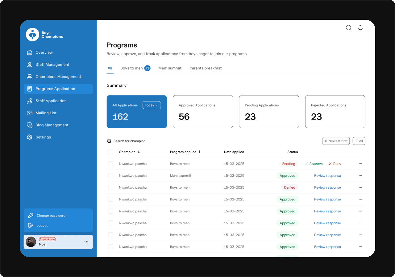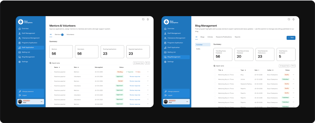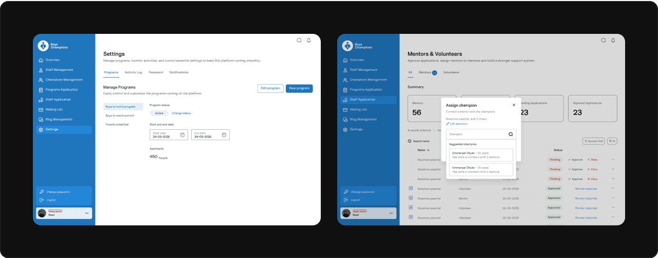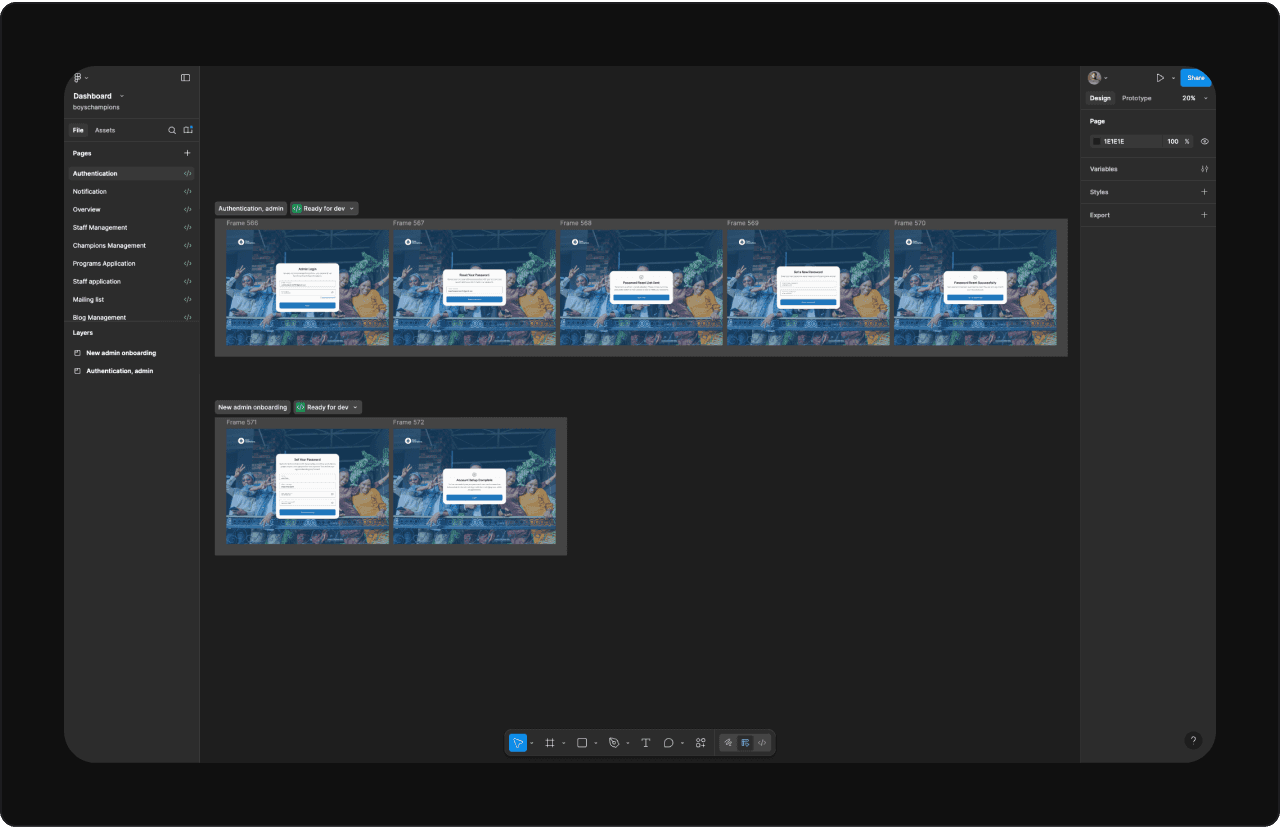 I started by mapping out the dashboard’s purpose and requirements. This meant working closely with the Boys Champions team to understand their workflows, pain points, and must-have features. Once the big picture was clear, I planned the user flows, tackling the most critical parts first.
