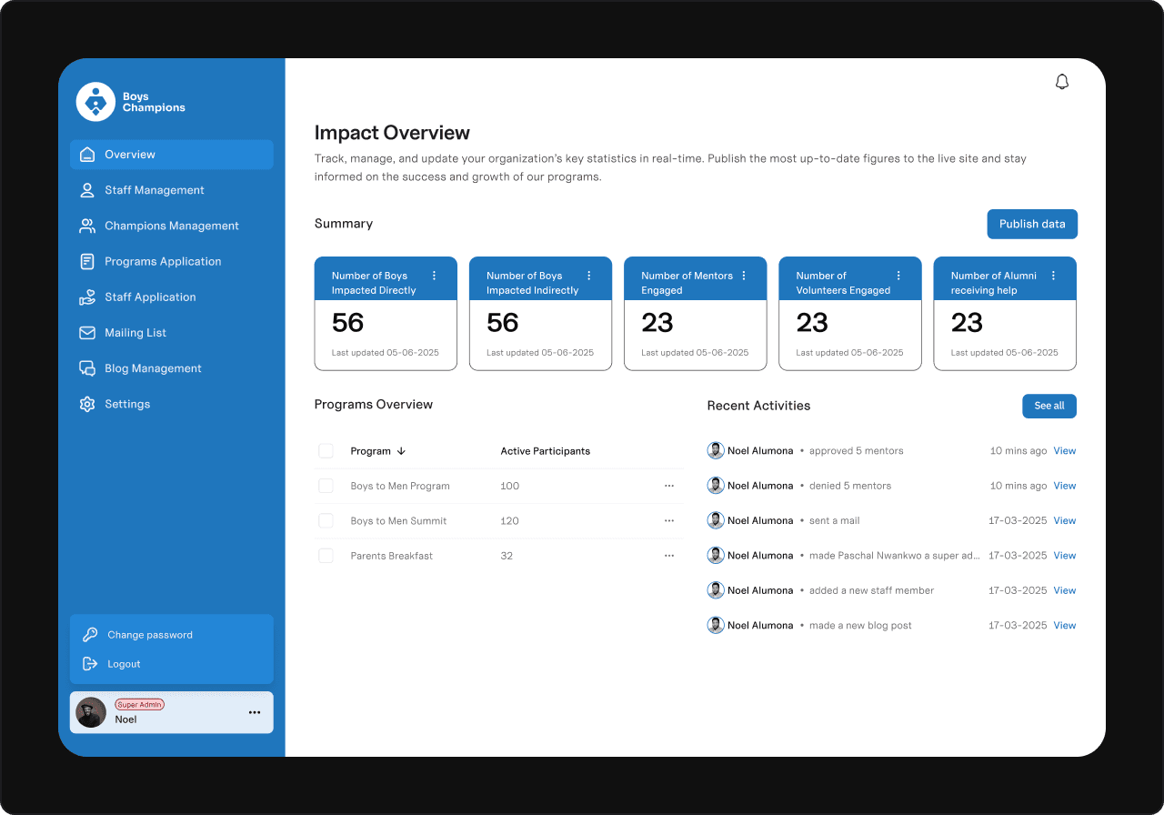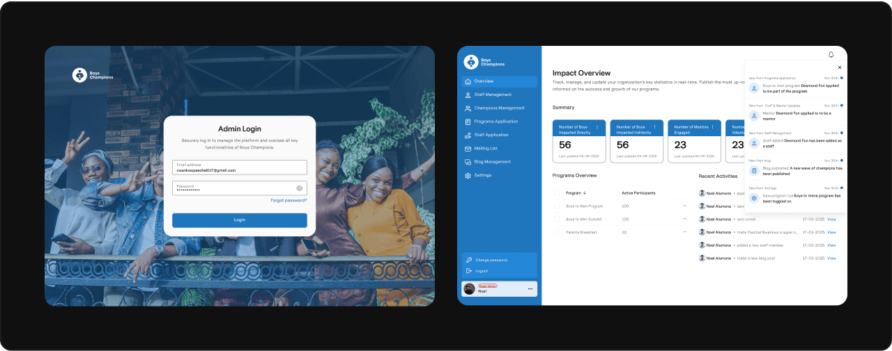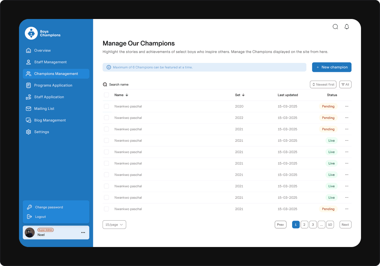 I started by mapping out the dashboard’s purpose and requirements. This meant working closely with the Boys Champions team to understand their workflows, pain points, and must-have features. Once the big picture was clear, I planned the user flows, tackling the most critical parts first.