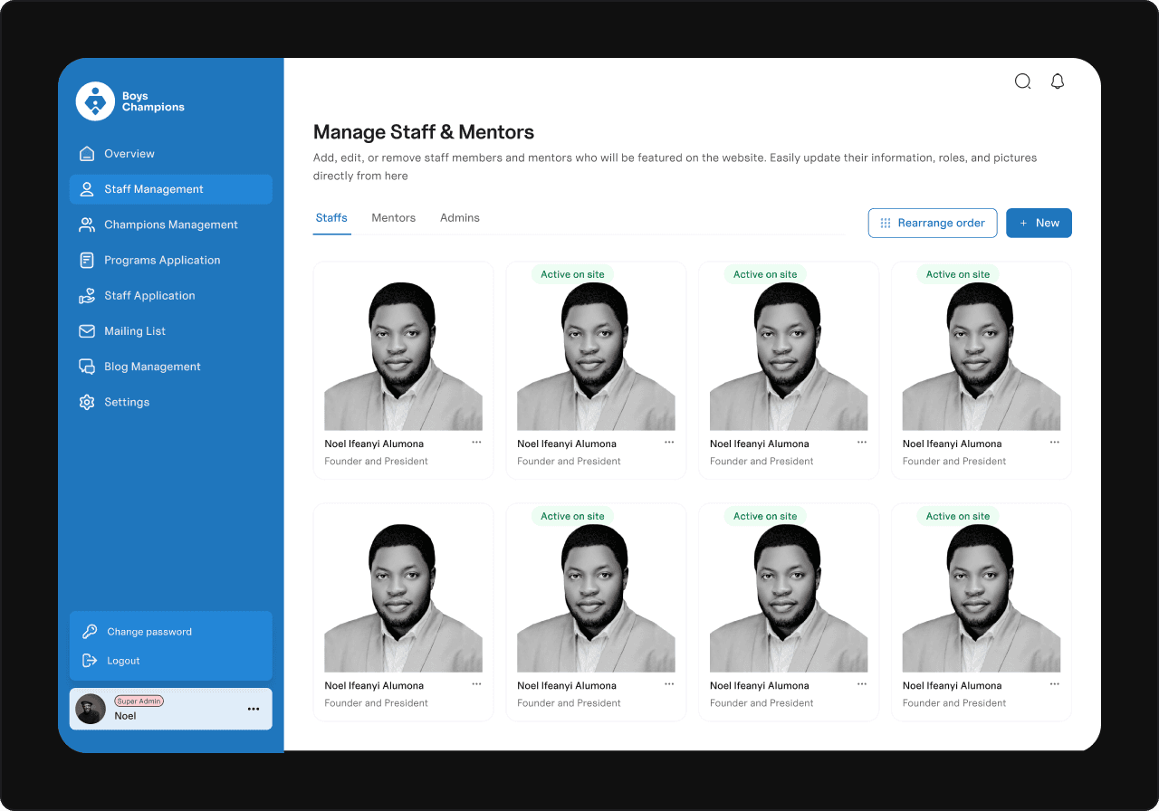 Next, I built the Staff Management section to handle all team roles in one place — Staffs, Mentors, and Admins. Even though only Staffs and Mentors appear publicly, including Admins here made internal management seamless.