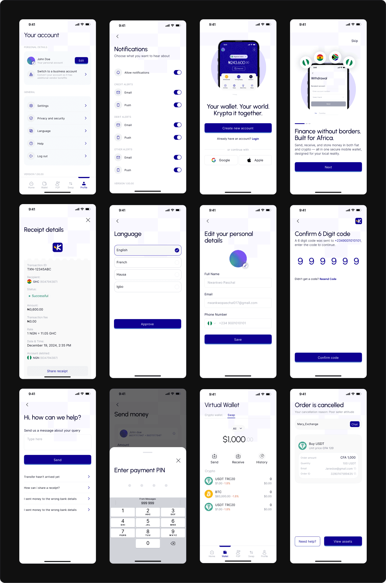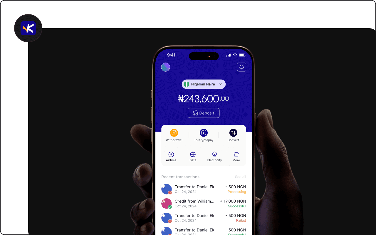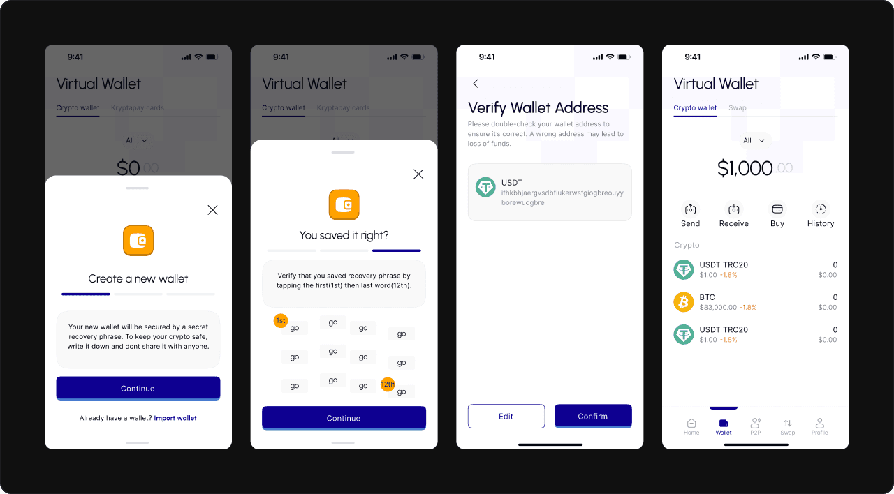 For the overall layout, I used familiar design patterns to ensure users felt at ease from the moment they opened the app, with a clean and cohesive design that kept Kryptapay’s unique features front and center.