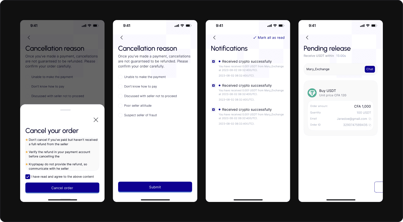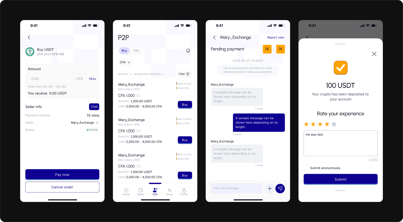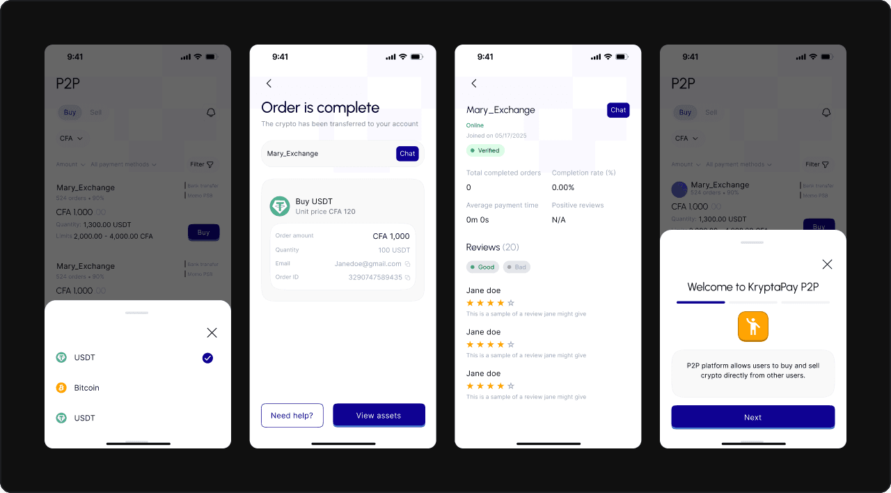 P2P Marketplace: I dug deep into existing platforms like Binance and Bybit, as these platforms have some of the most polished P2P experiences. The flow and design were similar to what I had seen, but I focused on tailoring it to Kryptapay’s brand and ensuring it felt fresh and native to the platform. The goal here was to create something familiar but intuitive and aligned with Kryptapay’s vision.