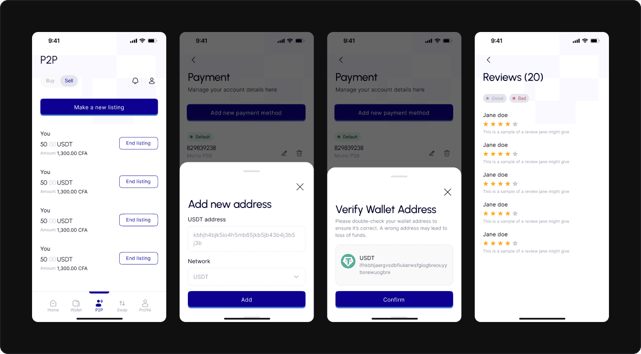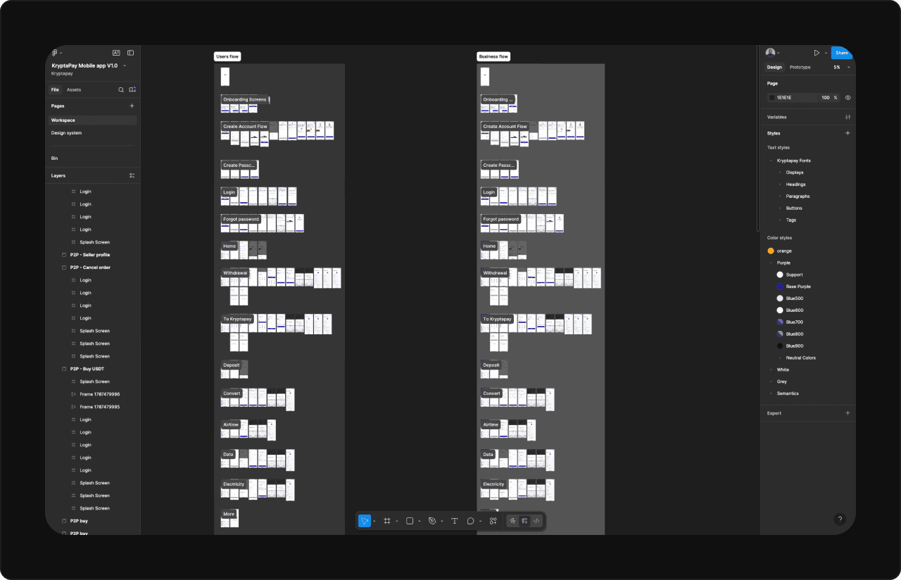 For the user side (bill payments and crypto transactions), I analyzed platforms like Binance and Bybit to study the P2P layout and flow, which were quite similar. I knew I needed to bring familiarity into the design while also ensuring the app would stand out with unique features like importing wallets and creating new wallets.
